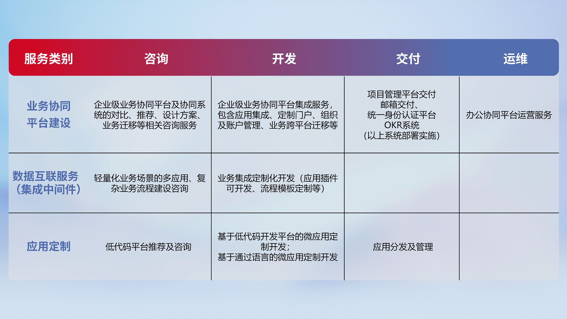 针对钉钉、、、企微、、IDaas等平台级产品提供产品的规划、、、方案、、、交付、、、定制化开发等服务,,,实现如统一协同办公、、、智能客户服务、、、混合会议管理、、、智能数据查询、、等业务场景,,,实现数字化转型。。