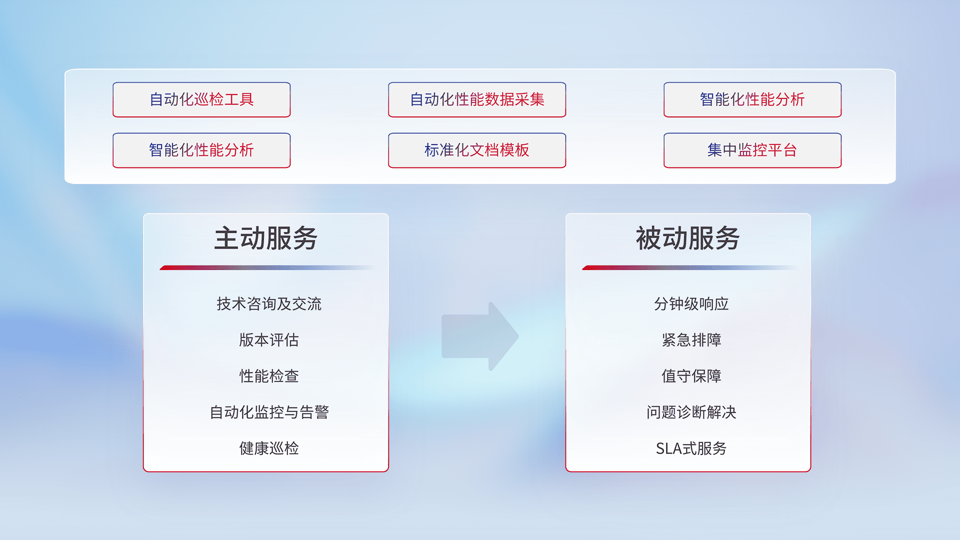 智能化工具和标准化文档,,,保障服务质量,,提供主动服务(包含技术咨询、、、版本评估、、性能检查、、、自动化监控与告警、、、健康巡检)和被动服务包含(分钟级响应、、、紧急排障、、、、值守保障、、、问题诊断解决、、SLA服务)。。。
